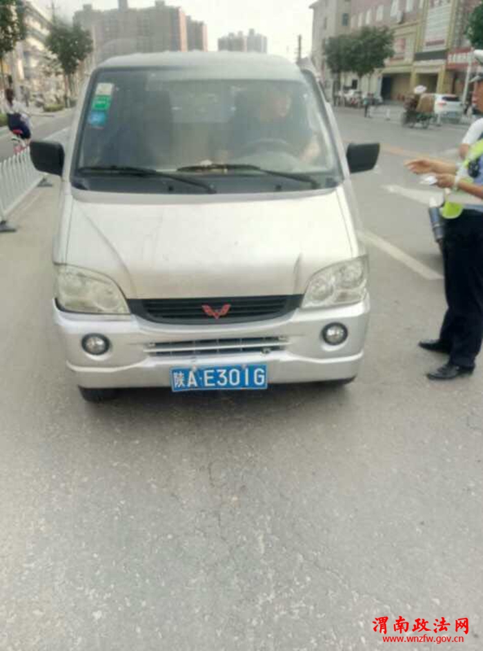 此时,城区中队一个执勤小组正在指导员种和平带领下,在频阳大街一带,积极开展预防重特大交通事故路面管控巡查。接到指令后,中队指导员种和平迅速带领民警李浩全、纪军锋、刘凡组织设卡拦截。并在频阳大道南段发现并成功拦截这辆陕A牌照的小型客车。司机不能提供有效驾驶证。