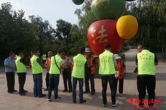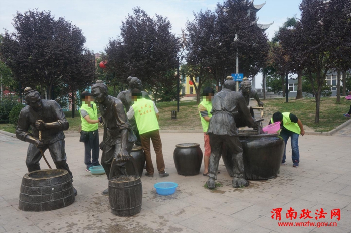 渭南政法网(白水县司法局)9月20日下午,白水县社区矫正执法大队一中队组织辖区内(史官、西固、雷牙)三十余名服刑人员在八名干警的号令下,统一集合,整齐列队,至白水县苹果广场指定地点进行社区公益劳动。在广场管理工作人员的配合下领取了脸盆、毛巾、扫帚等劳动工具,由一中队进行分工分区域进行保洁清洗。此次劳动主要是对广场的标识牌、地面进行擦拭、冲洗,清理林荫道的树叶与垃圾。所有服刑人员按规定穿着带有“白水司法社区服务”标识的马甲,人手一工具,在长达两个小时的劳动过程中没有偷懒,没有抱怨,大家都各司其职,积极认真,热情高涨。