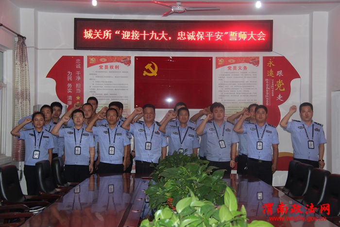 随后,全体民警在所领导的带领下举起右手庄严宣誓:“对党忠诚、服务人民、执法公正、纪律严明、歼灭隐患、补齐短板、严防死控、同心协力,以坚定的信念、激昂的斗志、过硬的作风和一流的标准投入“十九大”安保维稳工作,坚决打赢“十九大”安保维稳这场硬仗”。铿锵有力的誓言响彻整个会议室,进一步凝聚了警心、鼓舞了斗志,大家表示会立足十九大安保维稳工作,落实各项责任和措施,确保辖区治安稳定,向党的“十九大”献礼。