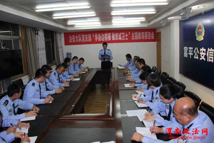 渭南政法网(富平公安讯)国庆、中秋将至,党的十九大即将召开,为了进一步加强支部思想阵地建设,强化队伍意识形态教育,提升民警政治大局意识,全面贯彻“四句话、十六字”要求,凝聚强大精神力量、汇聚更大攻坚动力,为十九大安保打造战时过硬思想保障,9月28日,富平县公安局治安大队举办“学身边楷模 做忠诚卫士”主题教育报告会。