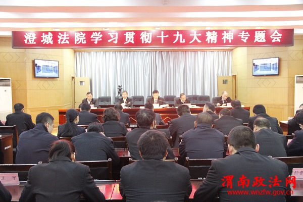 渭南政法网(特约通讯员 李晓媛)11月6日,澄城法院分别召开领导班子和全院干警大会,组织学习渭南市委常委、统战部部长、政法委书记樊存弟在永内村宣讲党的十九大精神讲话,进一步统一干警思想,对如何贯彻十九大精神进行再部署、再安排。院党组书记、院长周三军强调,要以十九大精神为指引,坚定理想信念,勇于担当忠诚履职,为提升“两率一度”再添助力。