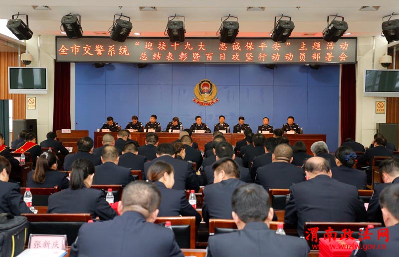 渭南政法网(市公安局讯)11月17日,市公安局召开全市交警系统“迎接十九大、忠诚保平安”主题活动总结表彰暨冬季预防重特大事故百日攻坚行动动员部署会。交警支队领导班子成员、机关副科以上干部,临渭、高交大队领导班子成员及全市创建活动的先进个人代表参加会议。市公安局副局长申军明出席会议并讲话。会议通报了全市公安交警系统“迎接十九大、忠诚保平安”主题活动开展情况,表彰奖励了先进集体和先进个人,高交、临渭、合阳大队作了大会发言。