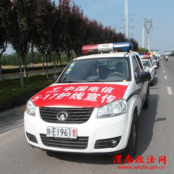 “军警民企”联合护线宣传是“三电”设施安全保护宣传月开展的一项重要内容。5月14日至5月20日,市“三电”办由市公安局经文保支队牵头,带领 “三电”企业和驻渭通讯部队30余人9辆车开展护线宣传活动。宣传车队分别从南北两线深入全市13个县(市、区)、30个乡镇、122个村庄,历时7天,行程700余公里。期间,宣传车队以重要“三电”设施传输线路和国防干线、沿线施工地、“三电”设施被盗案件高发地段、乡镇村及学校为宣传重点,通过播放录音、发放宣传资料、宣讲和张贴通告等方式,积极向当地群众宣传了“三电”设施保护的相关法律法规、盗窃破坏“三电”设施对国家、对人民群众生活造成的危害以及所要承担的法律责任。护线宣传活动中累计发放宣传单和宣传品18000份、张贴《渭南市公安局关于严厉打击盗窃破坏电力电信广播电视设施违法犯罪活动的通告》2000余份,直接受教育群众3万余人。