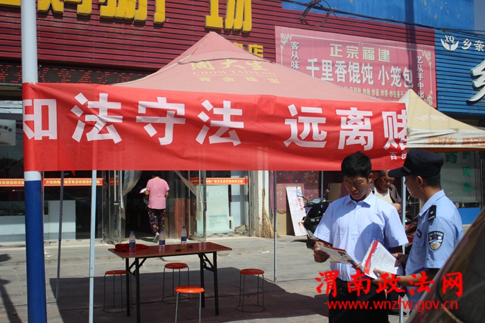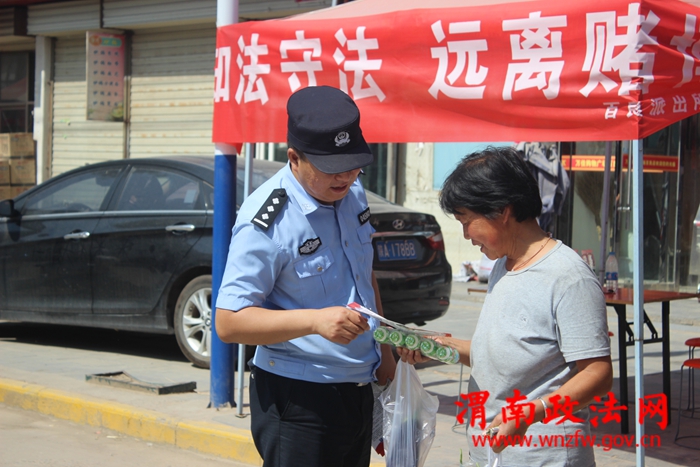 渭南政法网(通讯员 成玉莹)为了禁止赌博歪风,净化社会风气。2018年6月14日,百良派出所深入辖区万家广场人员密集场所开展禁赌宣传活动,民警通过多种形式,通过悬挂横幅,发放宣传彩页、向群众讲解了赌博的危害性和打击整治赌博违法犯罪相关法律法规。现场接受群众咨询,公布举报电话、展示公安机关打击赌博违法犯罪的成果,宣传典型案例和法律法规,营造良好的宣传氛围,让群众充分认识赌博对社会、家庭带来的危害,并号召大家坚决抵制和拒绝参与赌博。