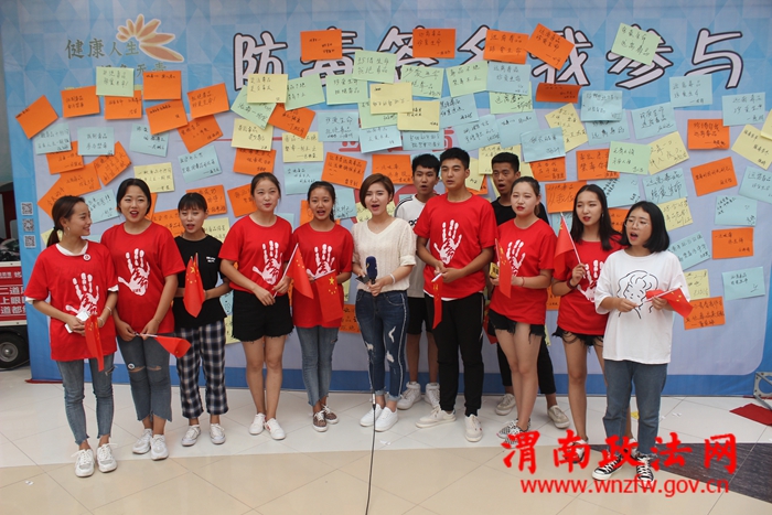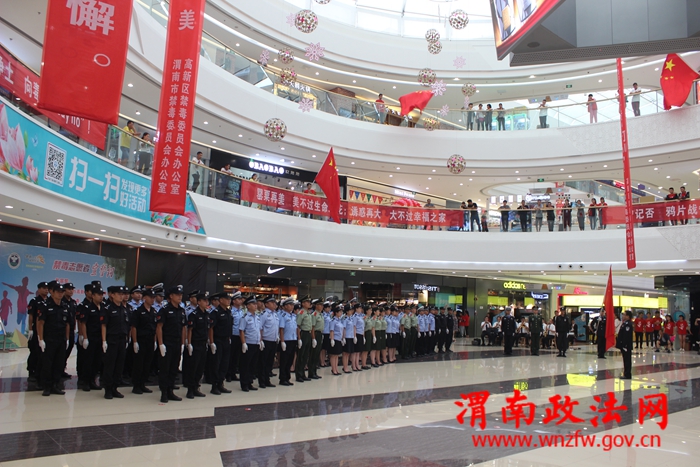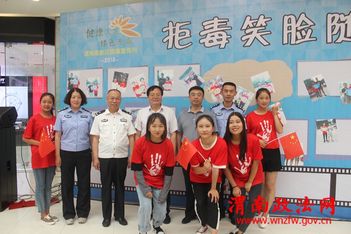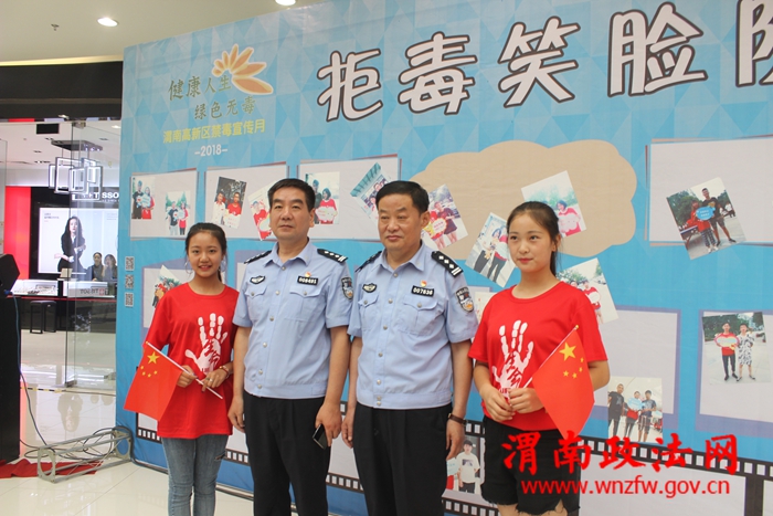 6月26日国际禁毒日,高新区禁毒办联合辖区渭南轨道交通运输学校在高新区万达广场开展以“健康人生、绿色无毒”为主题的“快闪”宣传活动。渭南市委政法副书记、市禁毒委副主任、市综治办主任贾重新,市禁毒委副主任、市公安局副局长张金龙,市禁毒办常务副主任、市禁毒支队支队长王晓鹏、政委王慧芳等市上领导同志,高新区禁毒委副主任、公安分局局长赵文昌,公安分局政委钞凤奎,区禁毒办主任、公安分局副局长王涛,副政委李彩玉等分局领导及辖区学生群众300余人参与了活动。