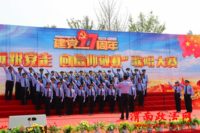 在渭华起义纪念馆外,华州区委举办的建党97周年“永远跟党走 向信仰敬礼”歌曲比赛的舞台上,华州区公安民警们不畏酷暑用嘹亮的歌声、雄浑的气势,热情洋溢地歌颂着党的丰功伟绩,展现出了华州公安不畏艰难、勇于斗争的良好精神面貌。
