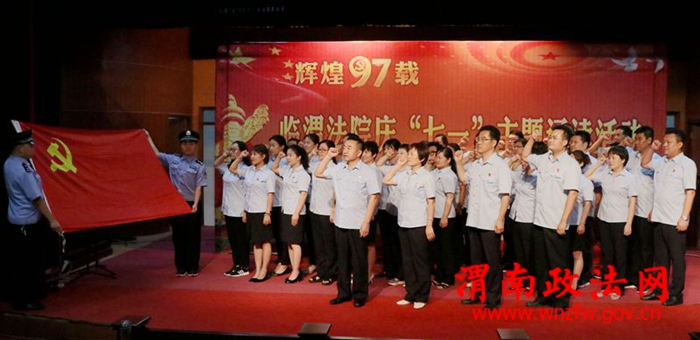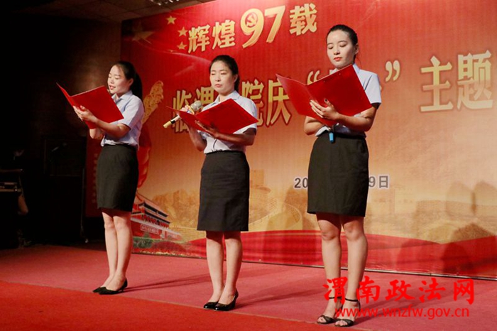 节目通过鲜活的事例、生动的语言、饱满的热情、强烈的感染力,从不同角度展现了发生在大家身边令人感动的先进事迹,演绎着临渭法院法官干警对党无比忠诚和对审判执行事业的无限热爱,充分展现了临渭法院“抓党建带队建促审判”和打造“队伍团结奋进,审判专业一流,管理精准到位,群众满意拥护”的临渭法院新形象以及临渭法院人永远忠于党,忠于人民,忠于法律的政治本色。激情洋溢、声情并茂的诵读,赢得阵阵掌声。节目临近尾声,全体党员干警在党组书记、院长童建军的带领下高举右拳,面对鲜红的党旗,重温入党誓词。