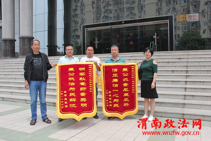 渭南政法网(通讯员 李晓刚 李园)近日,邵某拿着写有“明察秋毫断案英明 秉公执法为民解忧”、“秉公办案尽展风采 清正廉洁一心为民”的两面锦旗来到了蒲城法院,他是来感谢蒲城法院民事审判第二庭副庭长郝建锋和执行一庭庭长李晓刚两位法官的。