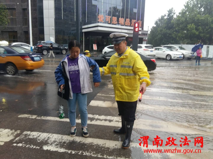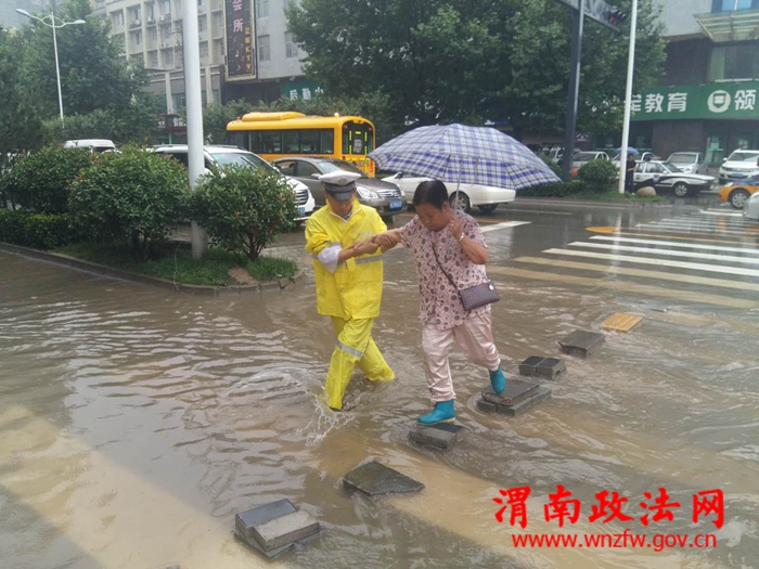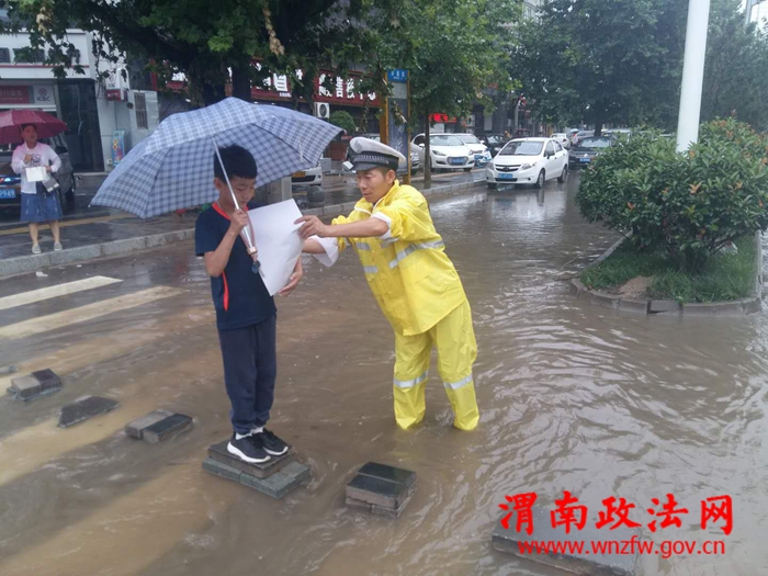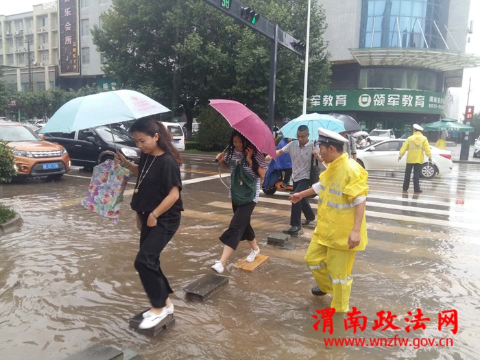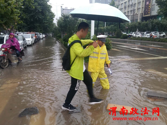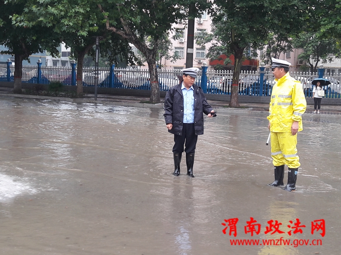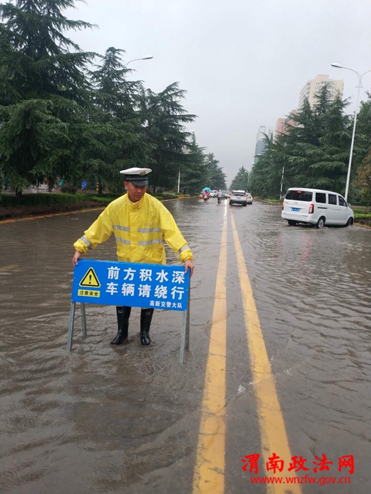 渭南政法网(通讯员 吴晓锐)2018年7月3日傍晚至4日早,渭南市持续降雨,部分路段出现大面积积水,交通一度陷入瘫痪状态。高新交警大队立即启动恶劣天气应急预案,在连续执行上合青岛峰会、足球赛、篮球赛安保任务和各类专项整治,整个队伍极其疲惫的情况下,全体民警不辞辛劳、提前到岗、快速反应、沉着应对、冒雨坚持奋战,妥善应对了恶劣天气警情,最大限度的降低了极端恶劣天气对辖区道路交通安全带来的影响。截止4日9时30分,大队共出动警力50人,警车10辆次,设置执勤点14处,排查积水路段7处,在积水路段摆放提示牌7个,发送提示信息2条。