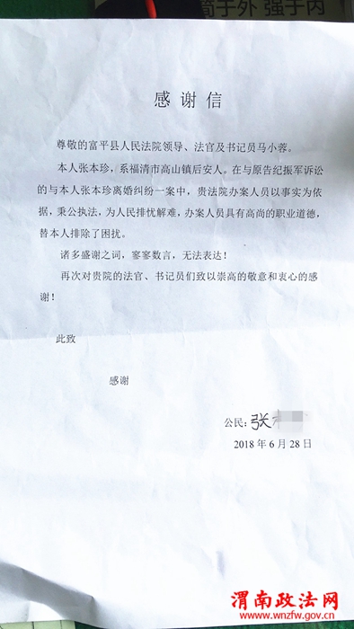 2018年4月16日,富平法院民三庭受理了原告纪某诉被告张某离婚纠纷一案,由于被告无法联系,办案法官驱车二百余公里至被告户籍所在地调查了解情况。经过与村社干部的谈话,以及对张某邻居朋友的走访,发现本案被告的身份信息虽与张某一致,但村里人都称张某早就嫁到福建了,且结婚证上的照片与张某有些许出入。为进一步核查情况,办案法官到当地派出所,市公安局调查了解,发现原告所诉被告与张某并非同一人,本案可能涉及骗婚情形。承办法官及时联系原告,告知其相关情况,要求其明确被告。与此同时,办案法官第一时间向远在福建的张某通告了情况,终于让无故被告的张某悬着的心落了地。为感谢法院,张某从千里之外邮来这封感谢信。