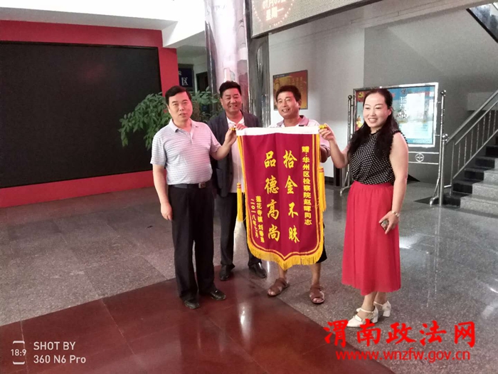 渭南政法网(通讯员 陈晓荣 杨颖)7月9日一大早,莲花寺镇瓦头村村民刘某早早来到华州区人民检察院,将一面写着“拾金不昧,道德高尚”的锦旗,送到该院诉讼监督部副部长赵晖同志手中,并赞扬了她拾金不昧的品质。
