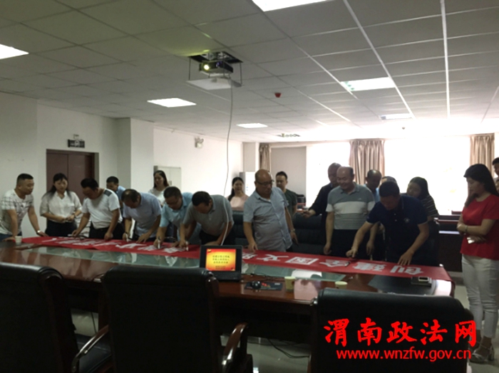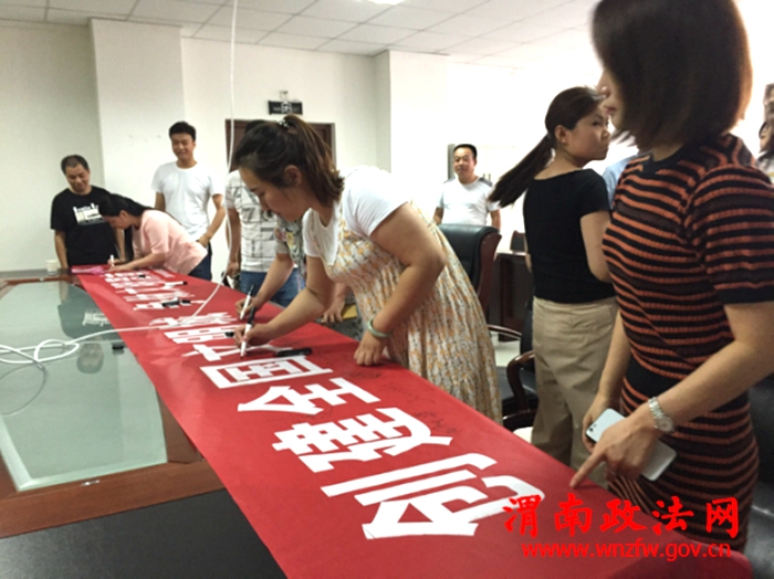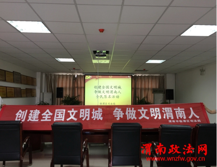 创建全国文明城市需要全民参与,2018年7月10日下午,渭南市临渭区司法局在局机关三楼会议组织开展“创建全国文明城 争做文明渭南人”全民签名活动。