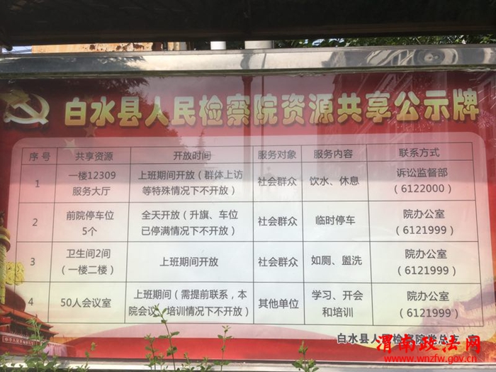 资源共享,是白水县工农社区党建工作的一项重要的创新工作,就是要求所属的各企事业单位、商业网点等将自己有余的资源向社区群众免费开放,并制作资源共享公示牌放置于大门外醒目位置,方便群众知悉,切实服务于社区群众。检察院党总支积极配合,领导高度重视,经会议研究决定,将检察院前院停车位、一楼二楼卫生间、一楼接访大厅、四楼会议室等资源向社会进行了免费开放,并将开放内容、开放时间、联系电话等在院外进行了公示。进入检察院院子的一侧,就能清楚的看到这个巨大的红底公示牌,并要求机关全体党员对前来享用资源的群众给予方便。