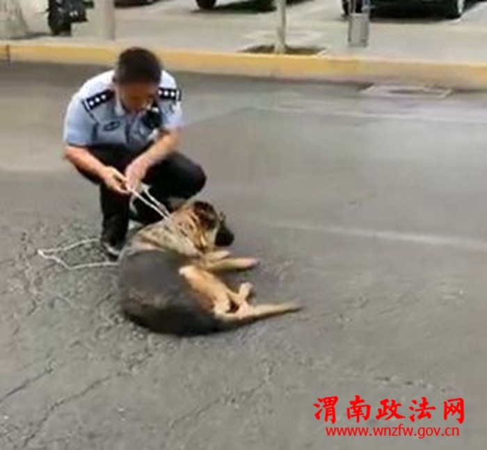 8月15日9时许,东风街派出所值班民警唐小革、王转武等人在出警回所途中途径东风街与民生街十字,发现有一只流浪狗横卧在马路中间,其体型巨大、浑身脏污,一边用警惕的目光看着人,一边瑟瑟发抖,让人恐慌。民警考虑到此狗可能随时会威胁到周围群众的人身安全,为了避免对周围无辜群众造成伤害,民警唐小革、王转武等人先行疏散周边围观群众,随后开展应对措施。民警唐小革找来绳索对该犬进行迅速抓捕并将其带回。在将该犬带回所里后,出于安全考虑,民警迅速将警情上报分局限犬办。随后,限犬办工作人员来到东风所,在民警的共同协作下将流浪狗捕获,并由限犬办带回处理,遏制了不安全事件的发生,及时消除不了安全隐患。