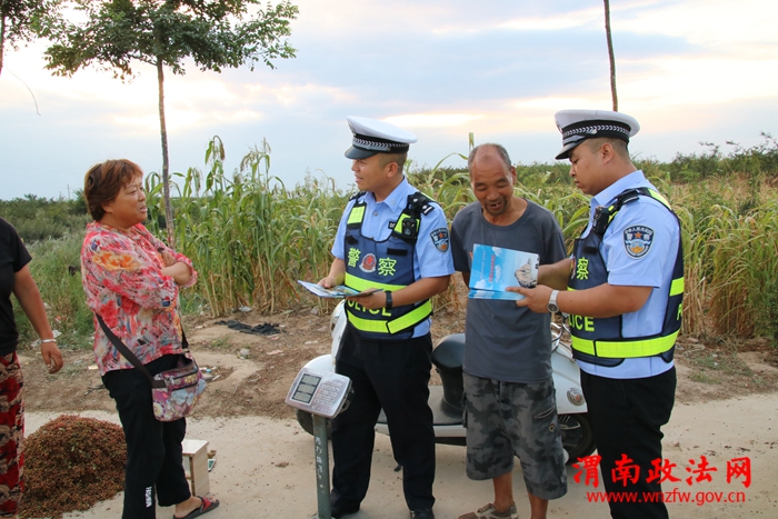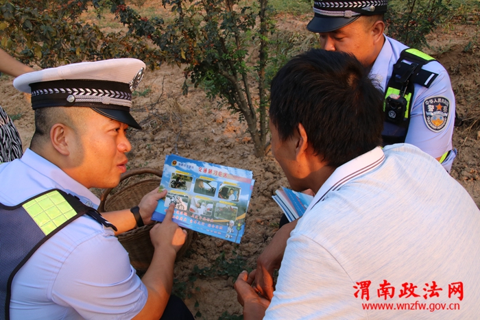 活动中,中队宣传小分队民警来到华阴市孟塬镇冯池、马村、晓鹏村,给正在田间耕作的农民朋友宣讲交通安全法律法规,传授交通安全常识。民警结合秋季农忙时节乡村道路农用车通行频繁,容易引发交通事故的实际,向群众讲解骑乘摩托车不戴安全头盔、摩托车多人骑乘、农用车载人、人货混装等违法行为的危险性,使群众全方位的认识到发生交通事故后所要承受的沉重代价。期间,民警向群众广泛发放了交通安全宣传彩页和《交通安全读本》,并通过以案说法、通报近期交通安全形势等内容,使群众对交通安全的重要性有了更清醒的认识,交通安全意识得到进一步提高。