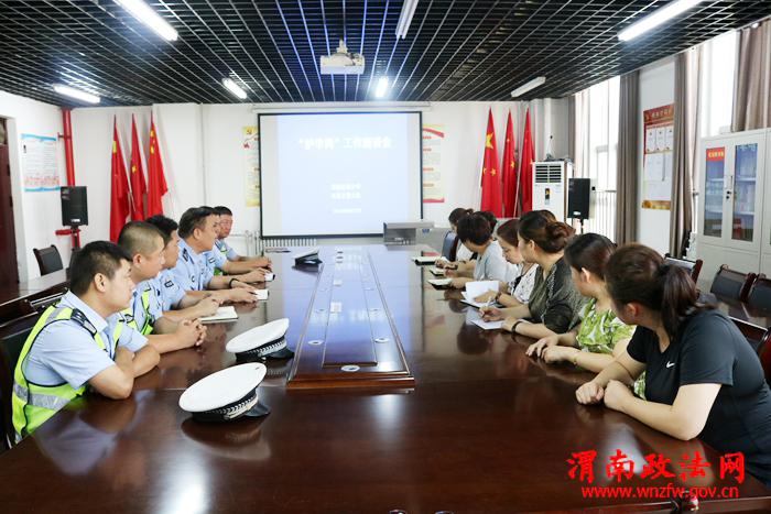 渭南政法网(高新交警讯)渭南市高新小学位于高新区育红路,处于繁华地段,校内有45个左右的班级,2400余名学生,为了切实做好高新小学的护学岗工作,8月23日下午,高新交警大队联合渭南高新小学共同召开护学岗工作座谈会。高新小学校长、老师、保安以及高新交警大队副大队长刘全红、事故预防处理中队长姬治国、城区中队长熊飞虎及护学岗三名民警参加此次会议。