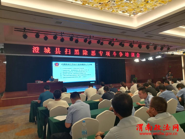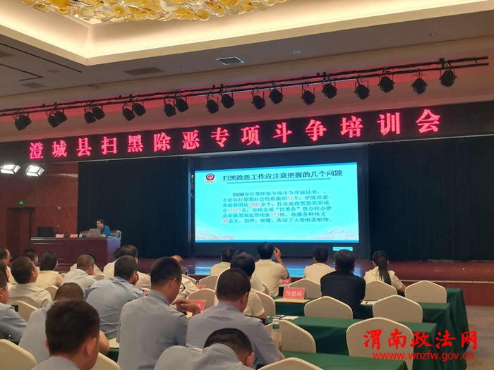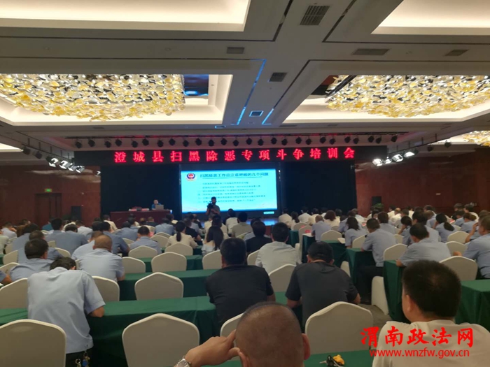 8月24日下午,澄城县扫黑除恶专项斗争培训会在万丽酒店五楼会议室召开。县扫黑除恶专项斗争领导小组各副组长、成员单位主要负责人,各镇(街道)党(工)委分管领导,县法院、县检察院、县公安局、县司法局一线政法干警共计100余人参加了会议。培训会邀请省公安厅刑侦局有组织犯罪侦查处处长杨满儒授课。