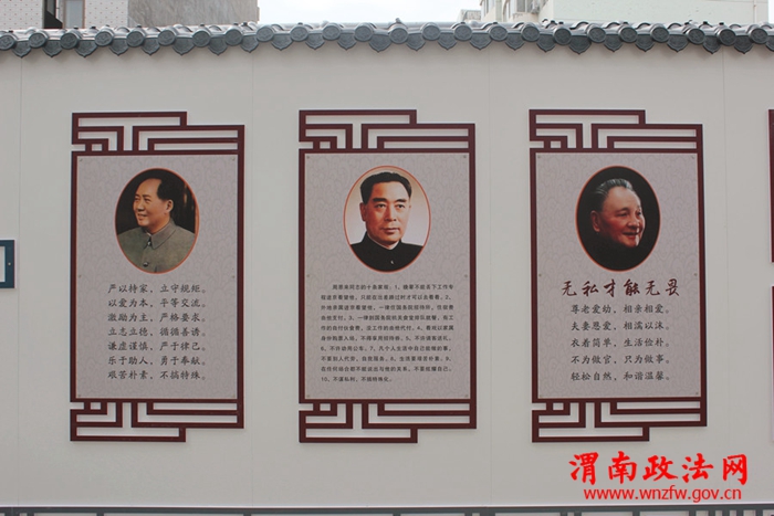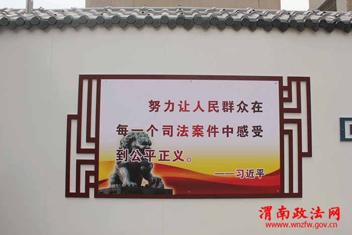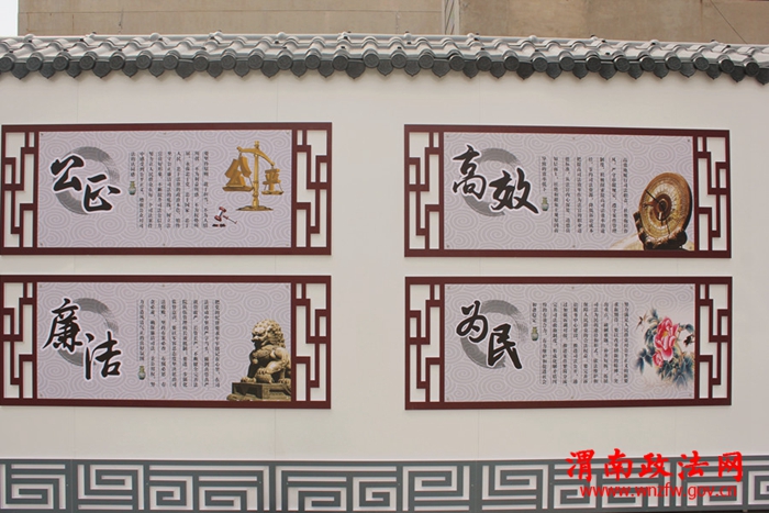 走进蒲城法院,南面栅栏墙上是社会主义核心价值观二十四字及结合人民法院实际的注解,教育引导法官干警将社会主义核心价值观内化于心、外化于行,努力实现法律和司法裁判的社会价值;西面首先映入眼帘的“努力让人民群众在每一个司法案件中感受到公平正义”是习近平总书记对司法机关提出的明确要求,也是蒲城法院始终秉承的工作理念;“公正、高效、廉洁、为民”是司法核心价值观的要求,“习近平总书记用典之摘选、古今法律格言、名人家训、新时期雷锋精神、公民道德规范、社会公德、职业道德、家庭美德”等内容格外醒目;“打造文明机关、争当文明使者、培育社会新风”将文明基因融入法官干警内心深处,以文明创建推进法院司法为民,用文明司法引领社会文明风尚。