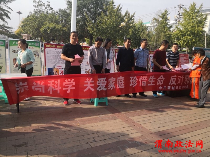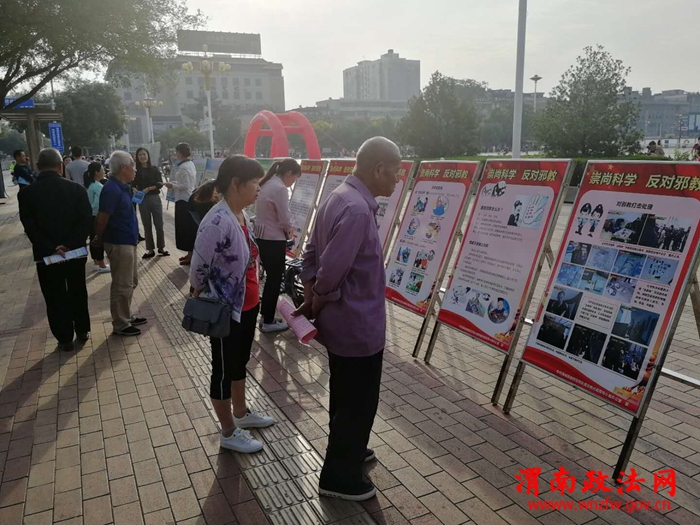 9月12日,蒲城县防范处理邪教办以县委县政府组织的“蒲城县2018年全国科普日宣传活动”为契机,在县中心广场开展“崇尚科学 关爱家庭 珍惜生命 反对邪教”主题宣传活动。用文字和图片的形式,通过揭示"全能神”等邪教组织的特征、危害,深刻揭露“全能神”等邪教组织反人类、反科学、反社会的罪恶本质以及投靠国际反华势力的卑劣行径。