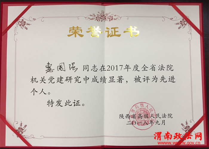 渭南政法网(通讯员 惠国强)9月29日,陕西省高级人民法院召开全省法院机关党建理论研讨会,会上对全省法院机关党建研究先进单位、先进个人给予表彰,蒲城法院党总支副书记惠国强同志作为先进个人代表做了经验交流。