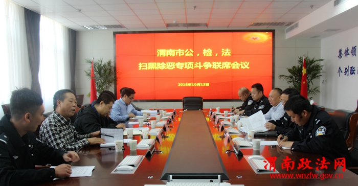 渭南政法网(市公安局讯)为进一步统一执法思想,提升工作效率,推动全市扫黑除恶专项斗争向纵深化开展。10月12日下午,市公安局“扫黑办”邀请市中级人民法院副院长傅桥舟、刑一庭庭长张东亮,市人民检察院副检察长石列、刑事检察处一处处长任俊潮召开第三季度公、检、法扫黑除恶专项斗争联席会议。市公安局副局长张金龙、刑侦支队长野青、市局“扫黑办”全体人员参加了会议。
