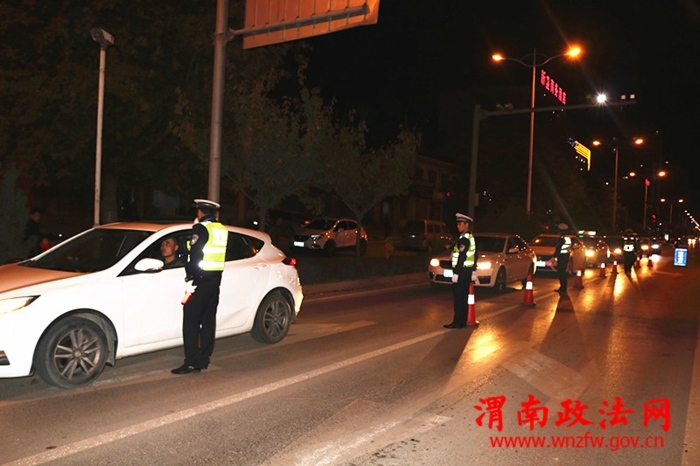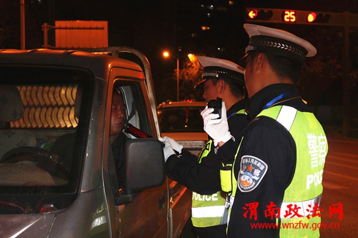 渭南政法网(通讯员 吴晓锐)为严厉打击酒驾毒驾违法犯罪行为,有效预防因酒驾毒驾违法犯罪行为造成重特大道路交通事故发生,切实保障广大人民群众生命财产安全,10月30日晚,高新交警大队与华州交警异地用警开展“三驾”交通违法行为集中夜查统一行动。