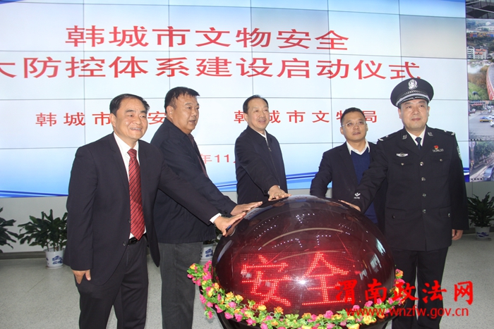 渭南政法网(通讯员 王涛)为贯彻落实习近平总书记来陕视察关于历史文物保护工作指示精神,切实加强文物安全,预防和打击文物违法犯罪,建立优势互补、资源共享、共同发展的联动防控体系,11月6日,韩城市公安局和韩城市文物局举行战略合作协议签字暨全市文物安全大防控体系建设启动仪式。启动仪式在市公安局举行,陕西省文物局党组成员、副局长钱继奎,省文物局副巡视员齐高泉,韩城市政府副市长刘德峰,市政府党组成员、公安局党委书记、局长宁双喜,市文物局党组书记、局长任万刚等领导出席了仪式,省文物局、延安市文物局、韩城市公安局、韩城市文物局有关部门参加了启动仪式。启动仪式由市文物局副局长师红心主持,