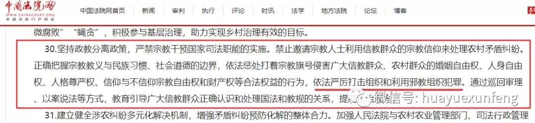 11月7日,最高人民法院发布《最高人民法院关于为实施乡村振兴战略提供司法服务和保障的意见》(以下简称《意见》)。《意见》明确提出,坚持政教分离政策,严禁宗教干预国家司法事务;依法严厉打击组织和利用邪教组织犯罪。