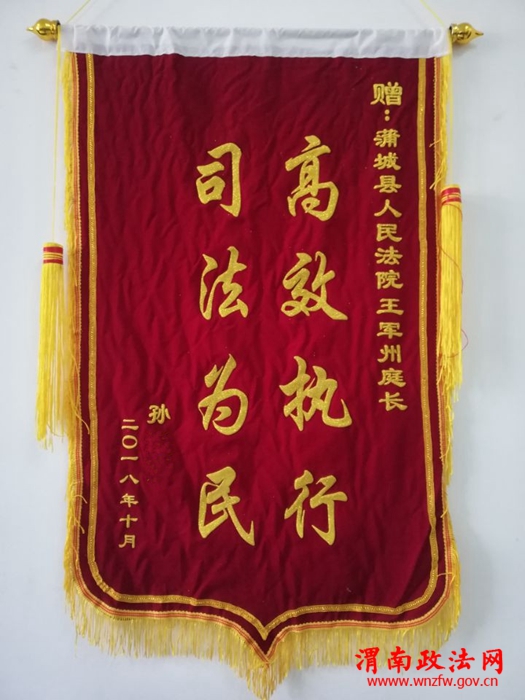 渭南政法网(通讯员 李园)近日,蒲城法院执行二庭庭长王军洲收到了一面写有“高效执行 司法为民”八个大字的特殊锦旗。说这面锦旗特殊,不是因为锦旗的内容特殊,也不是因为什么“外形制作”,而是因为这面锦旗是通过邮寄的方式寄过来的。