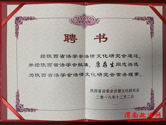 会上,富平法院康存生副院长被增选为陕西省法学会法律文化研究会常务理事。陕西省法学会法律文化研究会会长王蓓向增补的常务理事颁发了聘书。