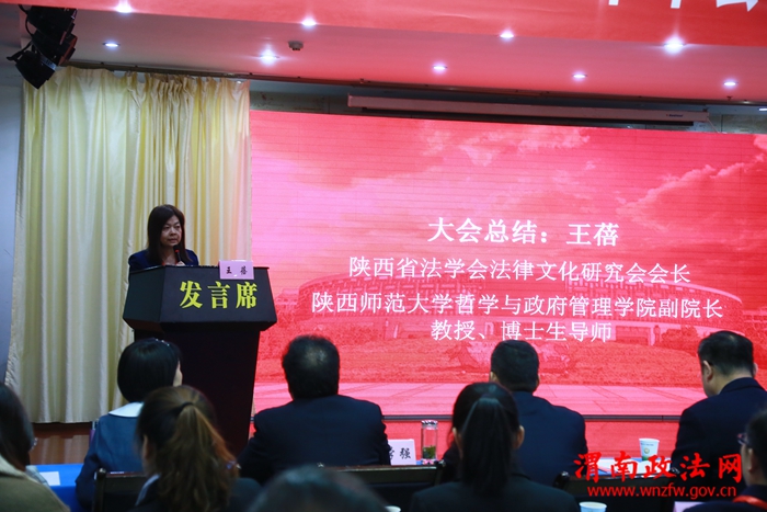 闭幕式由陕西师范大学哲学与政府管理学院法学系主任、副教授、法学博士穆随心主持,陕西省法学会法律文化研究会会长、陕西师范大学哲学与政府管理学院副院长、教授、博士生导师王蓓作总结讲话。王蓓教授从文化、法治文化、红色法治文化的现代价值,如何建设我们的法治文化和法治文化的理念、观念、制度、机制和方法论的反思三个方面总结了会议探讨的主题。她同时代表省法学会法律文化研究会向会议的承办方渭南市法学会、富平县法学会、陕西师范大学哲学与政法管理学院法学系以及筹备组的老师和同学表示感谢,向到会的嘉宾表示感谢。并希望今后与基层实务部门和其他院校多对接、多交流、多走动、多沟通。她表示通过这次会议,要从法律和道德的关系,法律和政治的关系,法律和科技的关系,人民司法、司法民主集中制与司法的规律和属性的关系,专业化、职业化与司法民主和司法灵动性的关系,惩罚与改造的关系,自治与他治的关系,审判与调解的关系等10个方面的课题中,在观念、理念、制度、机制和方法论上进一步的探究,为法治文化建设做出贡献。