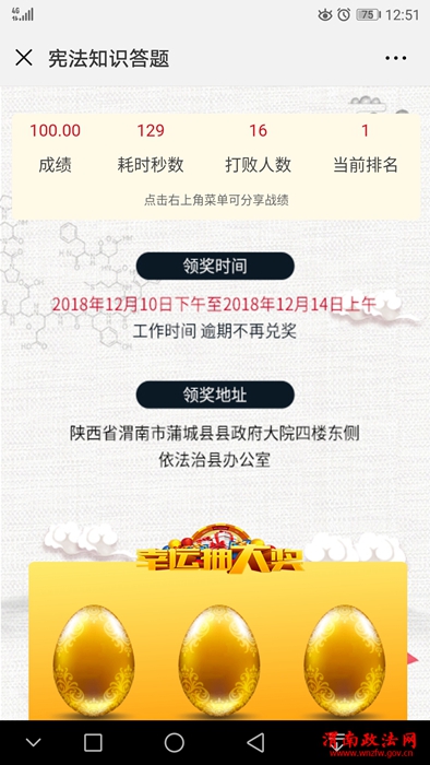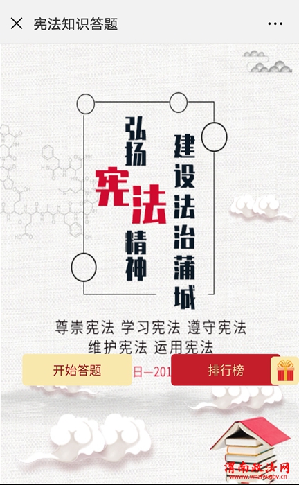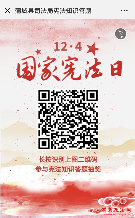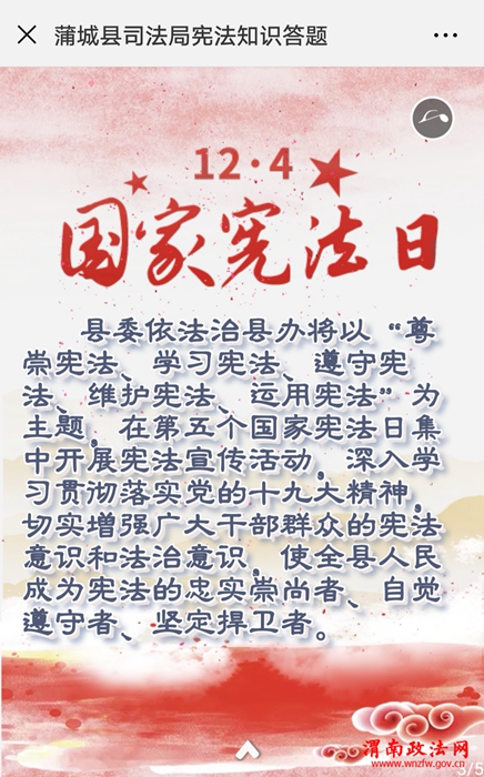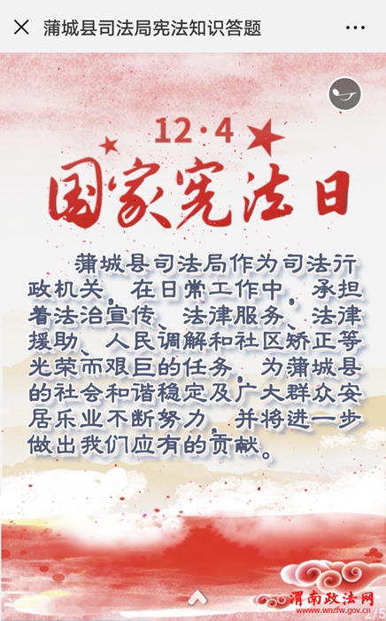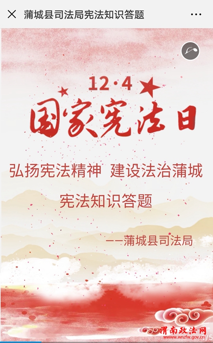 渭南政法网(通讯员 李少军)12月2日至12月8日,是我国首个“宪法宣传周”。为充分利用新媒体开展宪法宣传教育活动,推动宪法宣传在全县形成热潮,今年,我县和北京法研堂文化传媒公司合作,以“法治蒲城”微信公众平台为载体,在全县开展了线上宪法有奖答题活动。