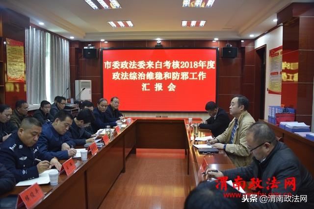 渭南政法网(通讯员 张李娜)12月19日上午,市委政法委第二考核组一行三人在市委政法委纪检组长姚宏斌带领下对白水县2018年度全县政法综治维稳和防邪工作进行年终考核。考核组首先查看了各项工作印证资料,随后在县委政法委会议室召开会议,听取了工作汇报。县委常委、政法委书记武师民主持会议并汇报工作,政法各部门主要领导和政法委全体机关干部参加会议。