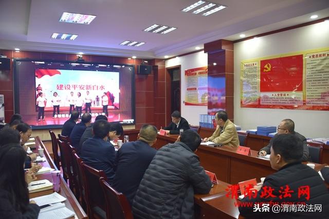 汇报会上,考核组观看了《建设平安新白水》快板视频,县委常委、政法委书记武师民从六个方面详细汇报了白水县2018年度政法综治维稳和防邪工作,一是领导重视,保障有力,共建共治共享格局形成;二是加强预警,源头处置,重大社会风险防范有力;三是突出重点,综合治理,平安白水迈上更高水平;四是深化司改,科技助力,执法司法工作规范有序;五是注重服务,彰显权威,法治白水建设卓有成效;六是党建引领,严管队伍,全力打造政法铁军形象。在听取汇报的同时,考核组通过大屏幕观看了白水县平安建设和扫黑除恶宣传工作图片。