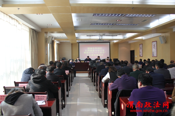 渭南政法网(通讯员 周伟)为了进一步推进工作,2018年12月20日渭南市华州区召开了扫黑除恶专项斗争暨新时代“十个没有”平安建设推进会。区委副书记蒋会海同志主持会议。区委常委、政法委书记孙跃民,区政协副主席、公安分局局长师正利,区法院院长张艳琴及各镇(街道)党委书记、分管副职,综治委各成员单位、扫黑除恶领导小组成员单位共计80余人参加会议。
