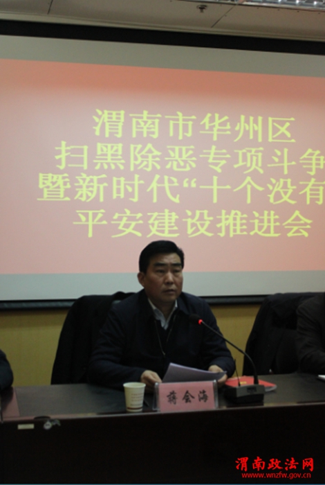 渭南政法网(通讯员 周伟)为了进一步推进工作,2018年12月20日渭南市华州区召开了扫黑除恶专项斗争暨新时代“十个没有”平安建设推进会。区委副书记蒋会海同志主持会议。区委常委、政法委书记孙跃民,区政协副主席、公安分局局长师正利,区法院院长张艳琴及各镇(街道)党委书记、分管副职,综治委各成员单位、扫黑除恶领导小组成员单位共计80余人参加会议。