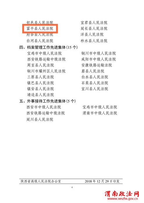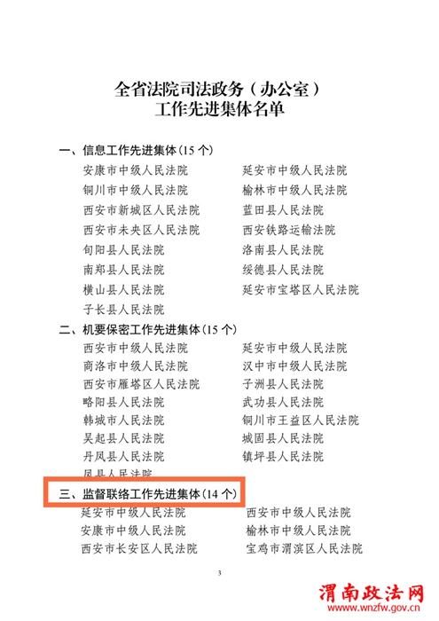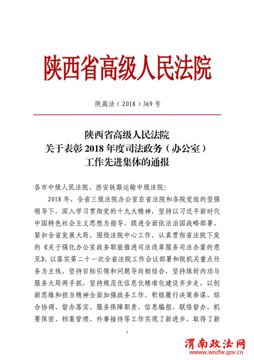 渭南政法网(通讯员 李俊)近日,省高院对2018年全省法院涌现出的司法政务(办公室)工作先进集体进行了通报表扬,富平法院被表彰为“全省法院监督联络工作先进集体”。