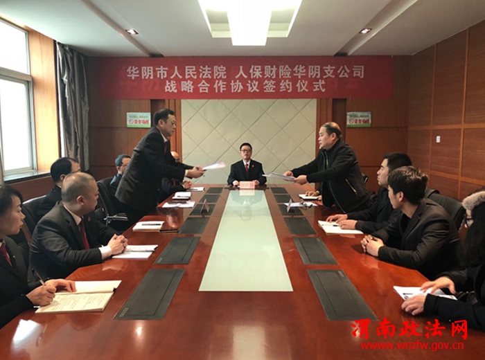 渭南政法网(通讯员 杨静)1月25日上午,华阴市人民法院与人保财险华阴支公司签署战略合作协议,建立破解“执行难”的联动合作机制,正式开启“人民法院+人民保险”的合作模式。华阴市人民法院党组副书记、纪检组长郭军荣,执行局全体干警和人保财险华阴支公司相关负责人出席签约仪式。双方就执行救助保险开展合作。