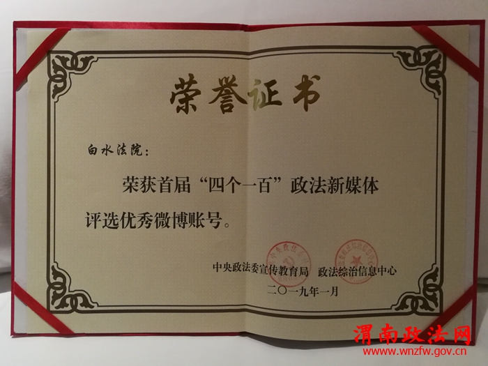 渭南政法网(通讯员 巨亚楠)1月29日下午,由中央政法委宣传教育局、中央政法委政法综治信息中心主办的首届“四个一百”政法新媒体榜单发布会在北京举行。经过数据分析、网络投票、专家评审等环节,从全国11万余个政法新媒体账号中,评选出100个优秀政法微信公众号、微博账号、头条账号、短视频账号。白水法院荣获优秀微博账号奖项。