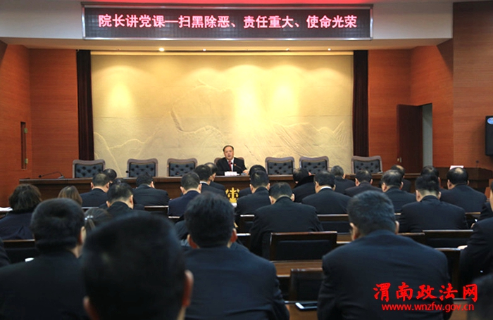 渭南政法网(通讯员 冉强)2月13日,根据华阴市委关于扫黑除恶专项斗争的工作安排并结合春训工作安排,同时为教育引导干警坚持以习近平新时代中国特色社会主义思想武装头脑,指导实践,推动工作,华阴市人民法院党组书记、院长饶秦军为全院干警上了一堂主题为“扫黑除恶,责任重大、使命光荣、义不容辞、不敢懈怠”的专题党课。此次党课内容由饶秦军精心准备。