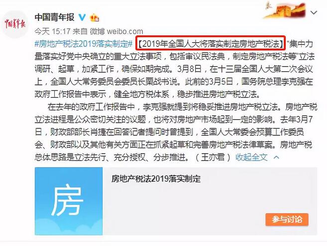 3月8日,在十三届全国人大第二次会议上,全国人大常务委员会委员长说:“集中力量落实好党中央确立的重大立法事项,包括审议民法典,制定房地产税法等”立法调研、起草,加紧工作,确保如期完成。此前的3月5日,国务院总理在政府工作报告中表示,健全地方税体系,稳步推进房地产税立法。