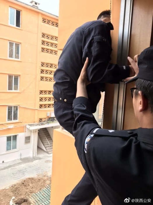 5月6日中午,华阴公安桃下派出所民警立即从屋外查看反锁房间的情况,当机立断从三楼阳台翻入孩子被锁房间,从屋内将门锁撬开,将孩子平安救出。