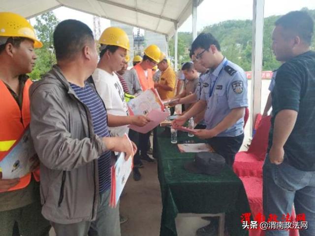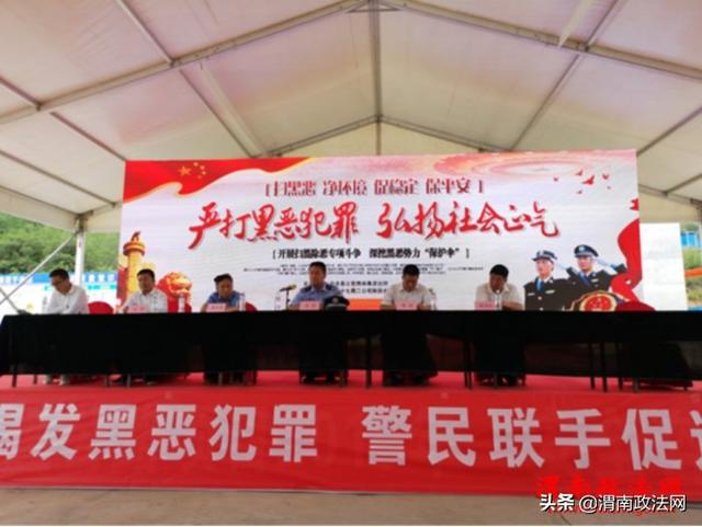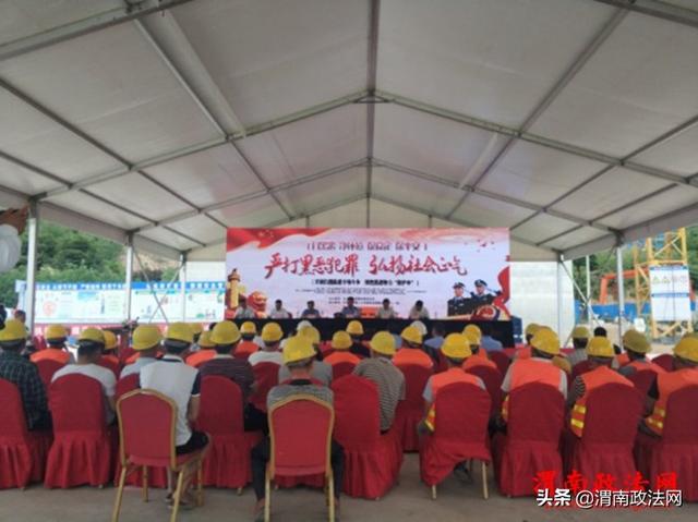 渭南政法网(通讯员 高磊)6月16日,为进一步推进扫黑除恶专项斗争向众深发展,努力营造人人知晓、个个参与的浓厚的氛围,强化扫黑除恶声势。由白水县公安局林皋派出所主办,中铁十七局二公司陕西合铜高速7标项目部承办的“严打黑恶犯罪 弘扬社会正气”主题活动在路村河工地举行。活动中通过宣讲扫黑除恶知识、公布涉黑涉恶线索举办渠道,激发辖区群众参与扫黑除恶的热情,积极参与到扫黑除恶专项斗争活动中。活动现场累计发放各类宣传资料200余份,悬挂宣传横幅10余条,摆放各类展板8块。