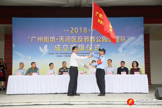 2018年11月16日,天河区在天河体育中心隆重举行“广州街坊·天河区反邪教公园巡逻队”成立授旗仪式。