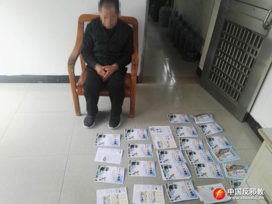 被抓获的男子及邪教宣传品。