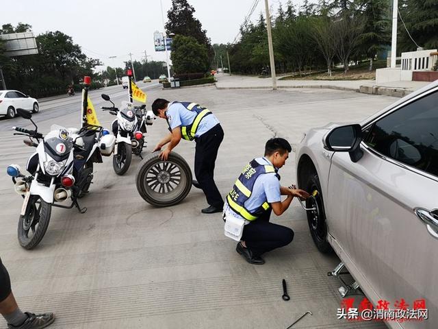 6月25日上午,华阴交警大队华山中队民警吴琪琪、迪函函骑乘警车在310国道华山丁字路桥段巡逻时,发现一辆车号为陕E7Y569的小轿车停在桥面,根据《交通交通安全法》规定,交叉路口、铁路道口、急弯路、桥梁、陡坡、隧道以及距离上述地点50米以内的路段不得停车,且该停车路段属于事故隐患路段,民警立即上前察看情况。经了解得知,车辆行驶中左前轮突然爆胎无法行驶,而驾驶员又是个新手,焦急万分。恰好民警吴琪琪有过多次施救经验,只见他立即摆好反光三脚架,熟练地打开车辆后备厢,取出备胎和维修工具,快速而娴熟地撑起千斤顶,开始更换轮胎,两名民警相互配合,十分钟将备胎顺利安装。