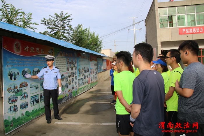 活动中,跑团成员在民警的引领下,观看了中队的文化长廊,民警详细介绍了中队的发展历程和近年来队伍建设方面取得的成绩,重点讲解了中队在近期扫黑除恶、“不忘初心、牢记使命”主题教育方面所做的工作。