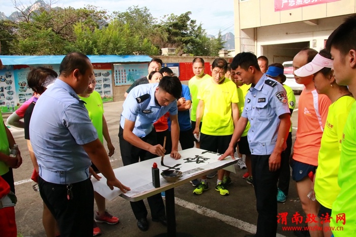 随后,民警侧重讲解了酒驾、醉驾的危害和酒驾查缉过程,并进行酒驾查处演示:民警现场准备一杯白开水和一杯啤酒,让群众先后喝下,随即利用酒精测试仪进行呼气测试,让大家直观的了解和感受查酒驾的过程,此时民警再结合今年查处的酒驾案例,讲解了酒驾处罚标准及醉驾法律后果,教育引导他们远离酒驾,文明出行。为更好地将安全行车理念植入每个人心中,中队民警马超现场挥笔,向跑团成员书写了一副“道路千万条、安全第一条”的书法,赢得了现场阵阵掌声。