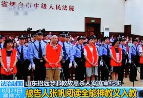 ▲ 2014年8月21日,招远“全能神”故意杀人案公开开庭审理。图片来源:央视
