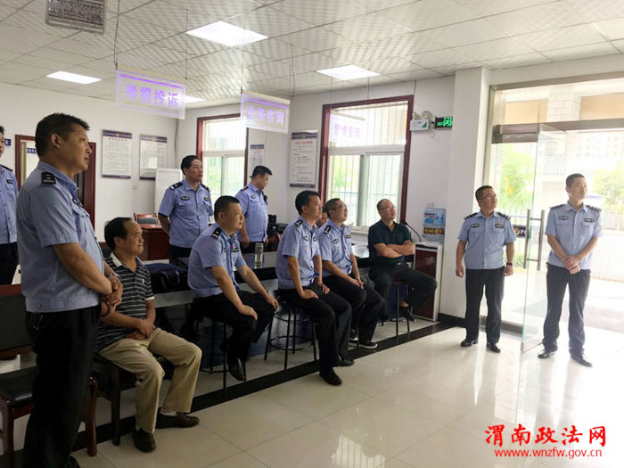 督导组在合阳县公安局金水派出所观看亮点工作《小程序解决大难题》视频短片介绍,并先后检查了金水派出所和九龙派出所接处警大厅、调解室、案管室,仔细查阅了相关台账及资料。